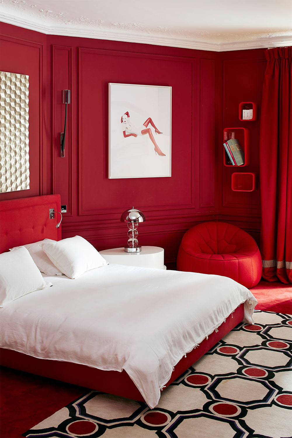 La cocina, espacio donde la familia se reúne a diario, conserva, en cambio, una atmósfera de armonía y serenidad. Para conseguirla, Géraldine pintó de negro el piso original que es de parquet en espiga, mientras que las molduras y chimeneas se conservaron en su estado original. En el dormitorio principal domina el rojo, que evoca la pasión y simboliza el amor.