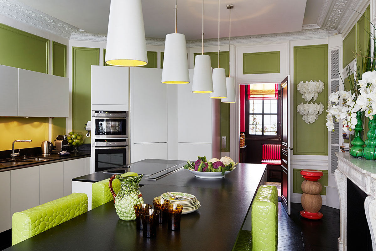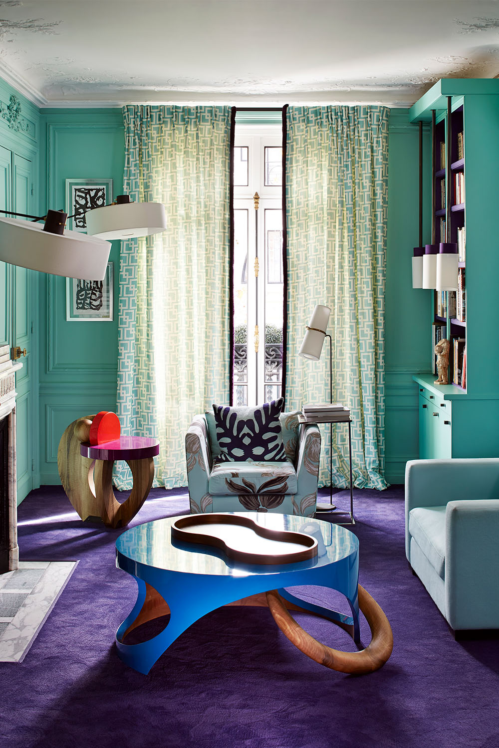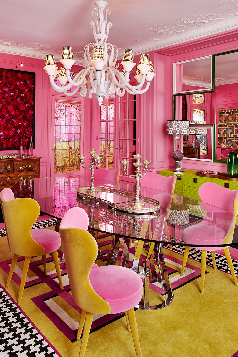 Para transformar la vivienda restauró las ventanas originales añadiendo una decoración floral en tonos ámbar que tiñe la luz y la vuelve cálida y agradable. Las paredes fucsias brillantes de muchos de los ambientes se compensan con una alfombra verde de pared a pared. El living, pintado de un azul vibrante, recoge una mezcla curiosa y equilibrada entre muebles contemporáneos y clásicos. El comedor, sin embargo, se presenta algo más recargado y recuerda a las habitaciones de los niños, pero en realidad pretende crear un ambiente fresco y romántico a partes iguales.