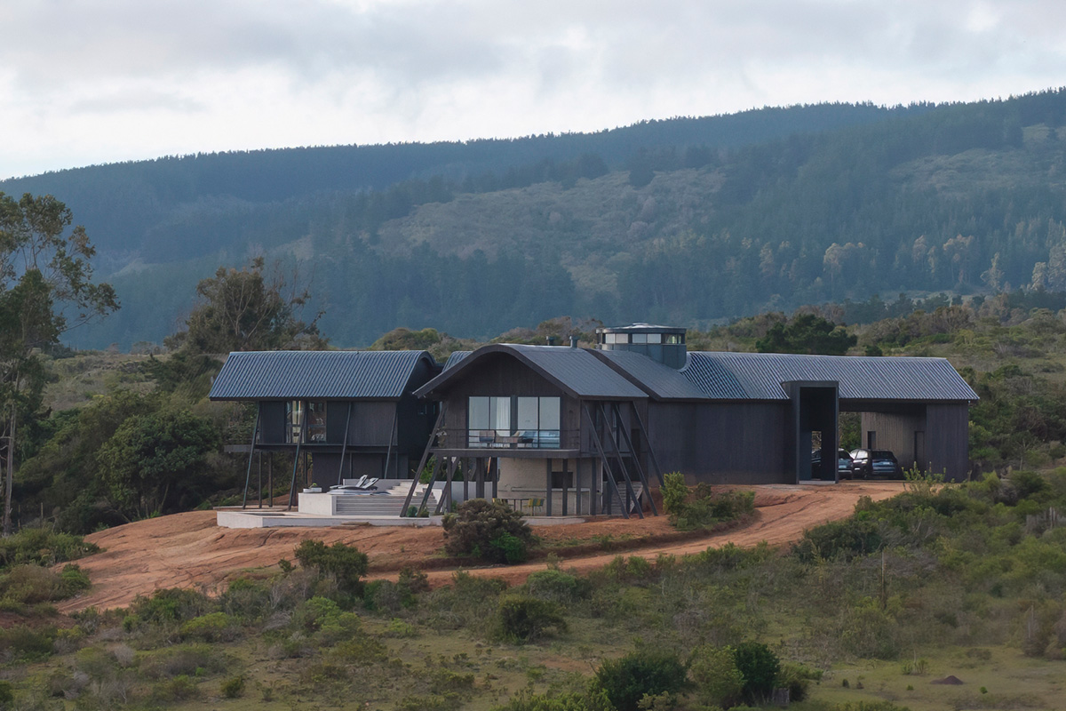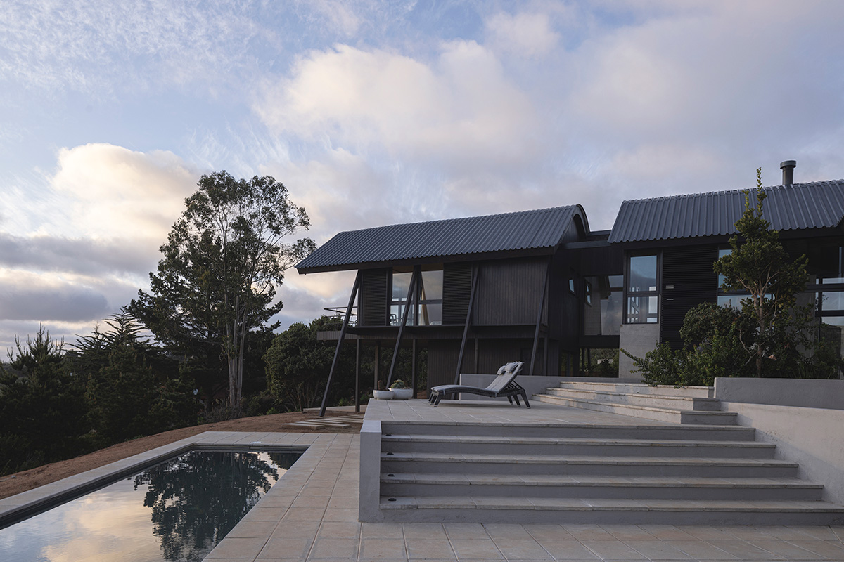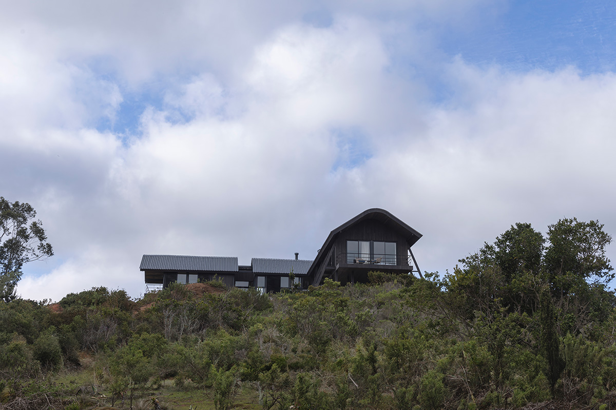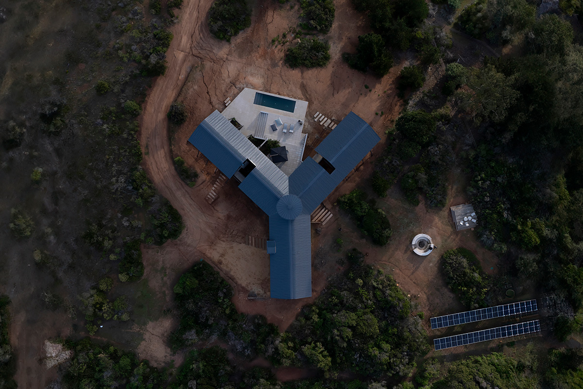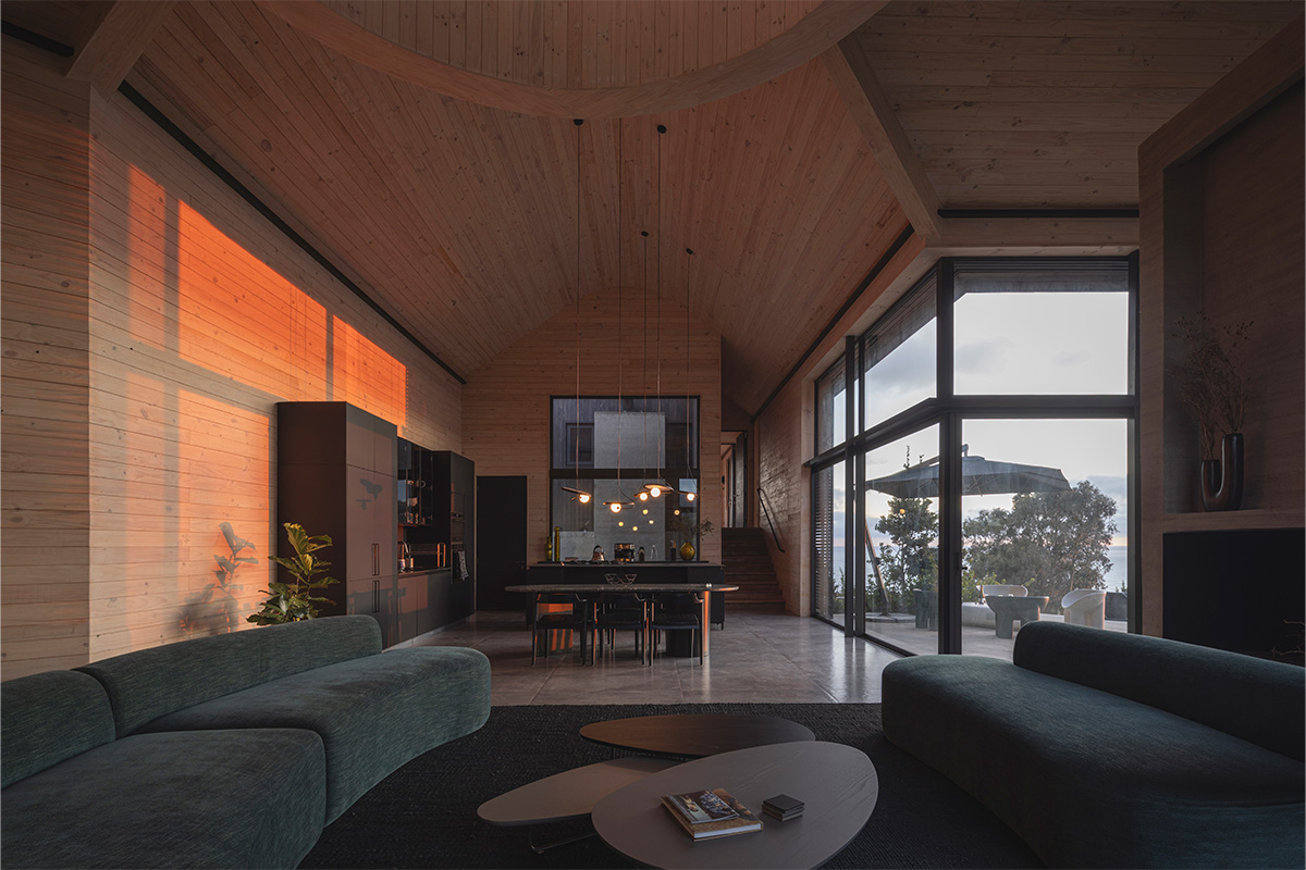 El proyecto se organiza en torno a una figura en “Y”, una configuración poco usual que permite mirar el paisaje desde múltiples frentes. Dos de las alas contienen el programa principal – dormitorios, biblioteca, parrilla y gimnasio – y forman entre sí un ángulo cercano a los 120 grados, generando una terraza central protegida del viento y conectada visualmente con el océano.