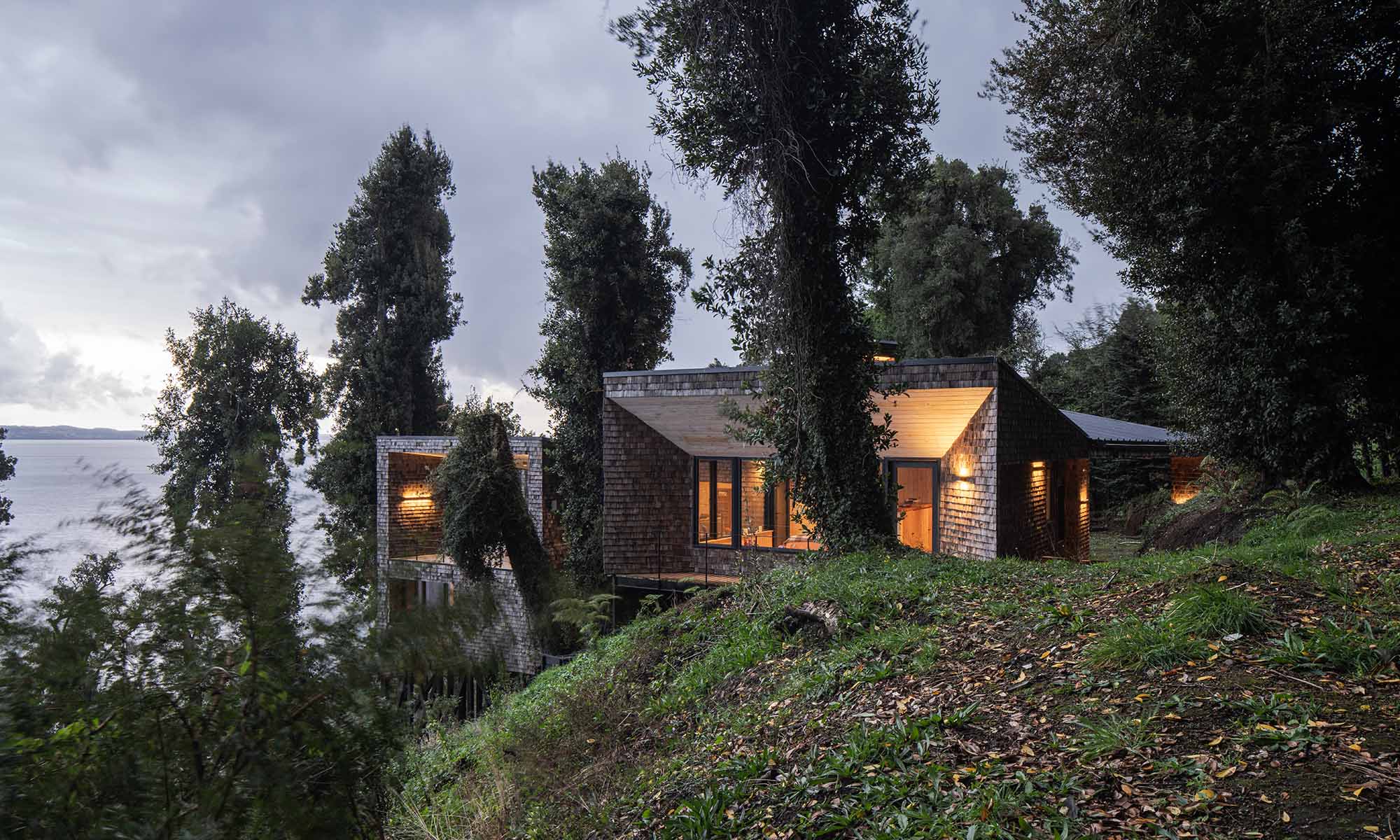 El proyecto se organiza en torno a una figura en “Y”, una configuración poco usual que permite mirar el paisaje desde múltiples frentes. Dos de las alas contienen el programa principal – dormitorios, biblioteca, parrilla y gimnasio – y forman entre sí un ángulo cercano a los 120 grados, generando una terraza central protegida del viento y conectada visualmente con el océano.