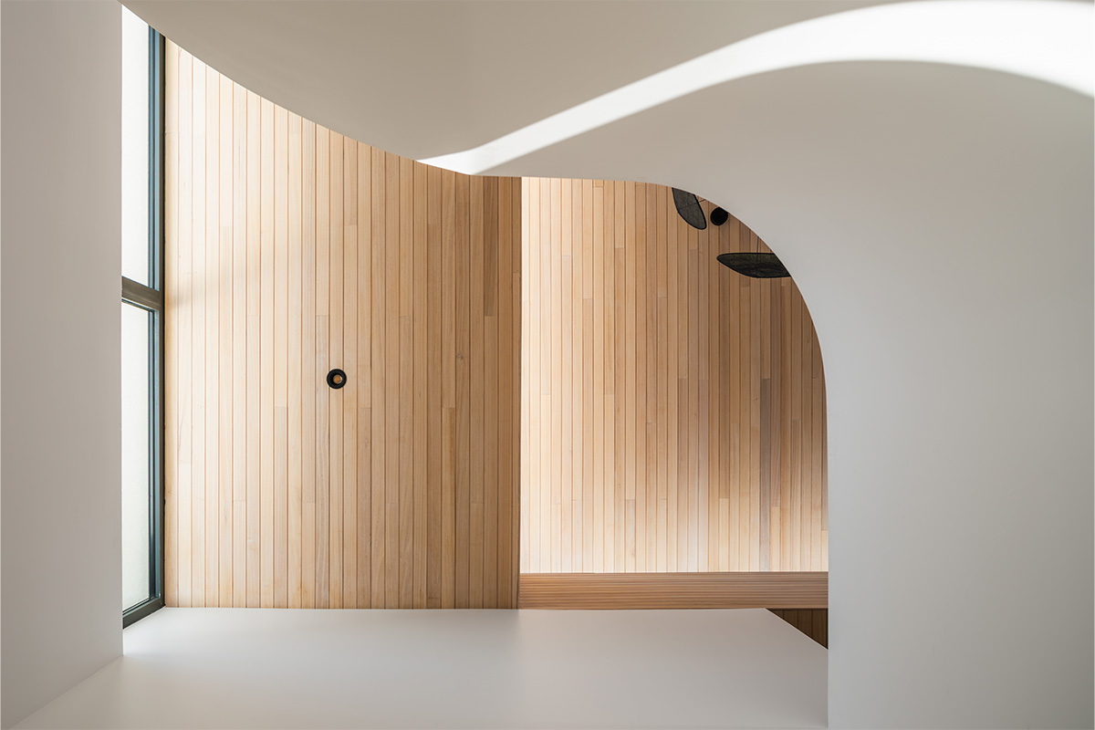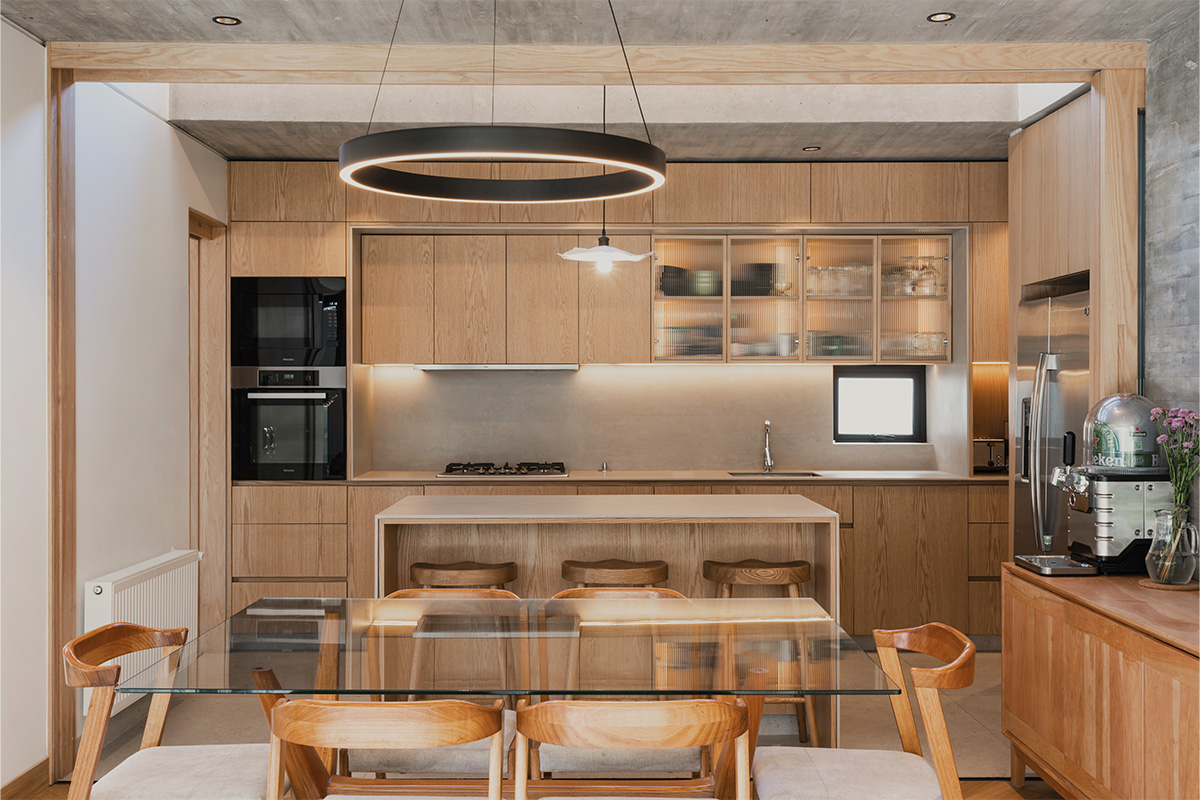 Por su parte, la materialidad utilizada refuerza esa idea de continuidad entre tiempos: madera de encina, roble americano, acero y superficies blancas componen una paleta atemporal y coherente. Cada elemento se relaciona con los otros, sin artificios ni contrastes forzados. En los interiores, la carpintería de madera, diseñada en colaboración con DProject, unifica visualmente los espacios y aporta calidez doméstica, mientras la iluminación acentúa la textura de los materiales y la forma curva de la escalera.
