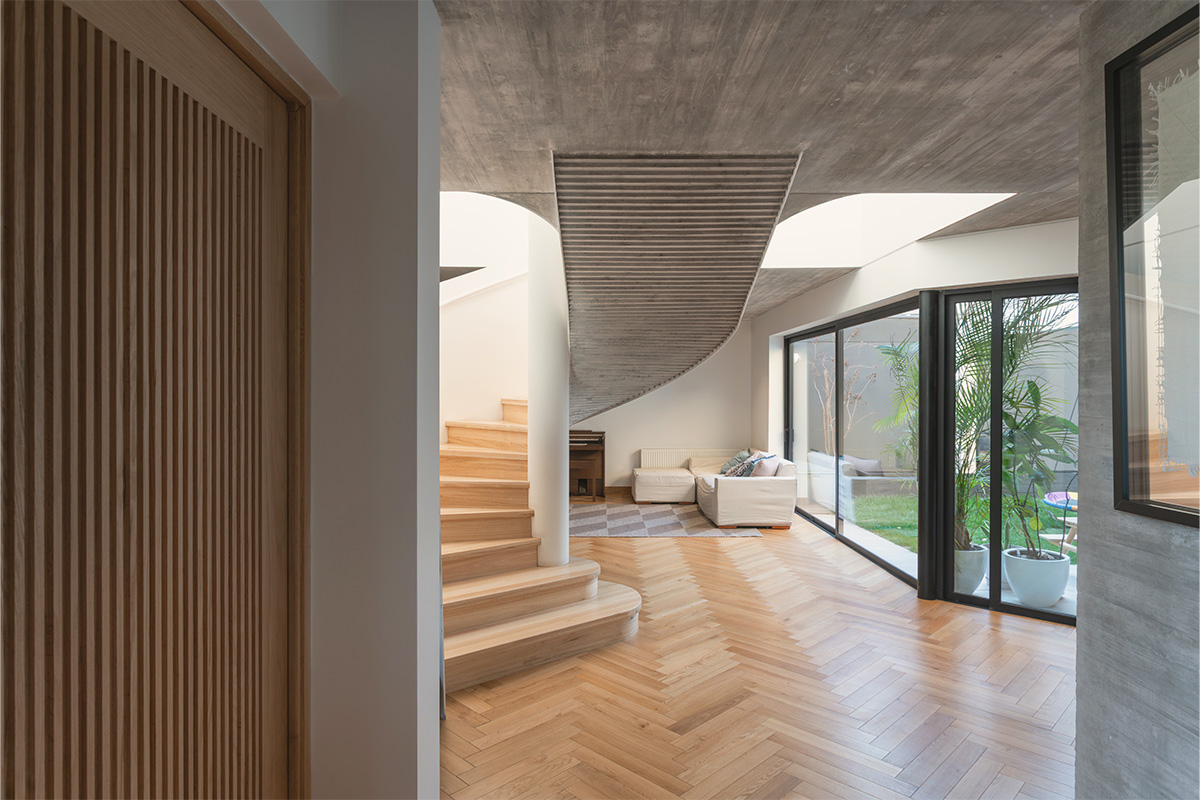 Esta espiral, ubicada estratégicamente en el centro del primer piso, se materializa en una combinación de acero curvado, estructura de hormigón visto y peldaños en madera sólida de lenga, cuya geometría introduce un contrapunto visual que dinamiza la planta abierta y conduce de manera fluida el recorrido entre niveles.