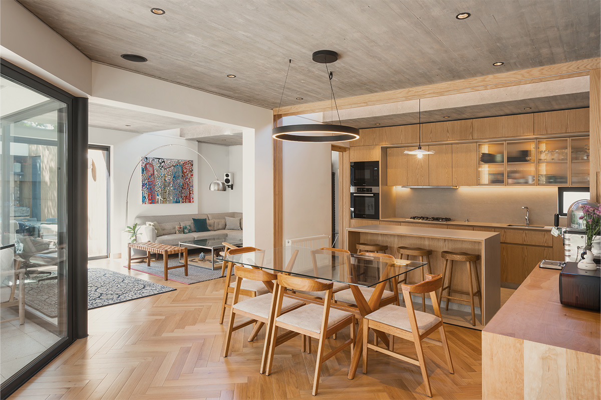 La arquitectura se enfoca en la luz para revelar las texturas de estos materiales. El primer piso se abre completamente al jardín y fue reconfigurado para integrar cocina, living y comedor. Esta fluidez se refuerza con la gran lucarna de hormigón estratégicamente ubicada sobre la cocina, que inunda el espacio de luz, marcando un ritmo de sombras que cambia según la hora.