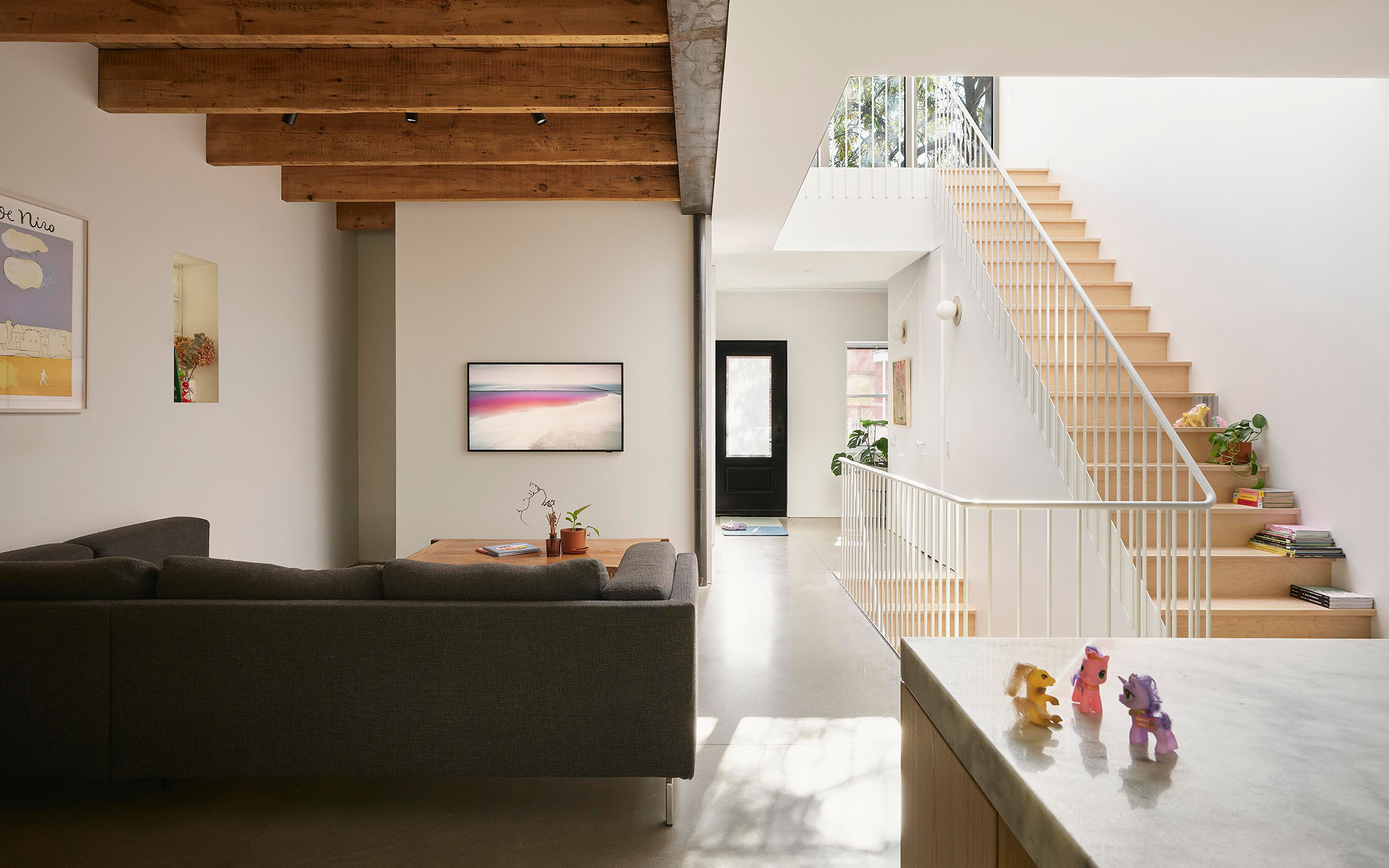 Puertas adentro, la casa se ordena a partir de la luz natural. Una escalera central, iluminada desde lo alto por un lucernario amplio, permite que la claridad se deslice hasta el corazón de la vivienda y conecte visualmente los distintos niveles. Hacia el fondo, grandes aperturas vinculan los espacios comunes con el jardín y la terraza, extendiendo el interior hacia el exterior y diluyendo los límites entre ambos. A pesar de una superficie acotada y una orientación compleja, el proyecto logra una sensación de continuidad, circulación fluida y espacios bien definidos.