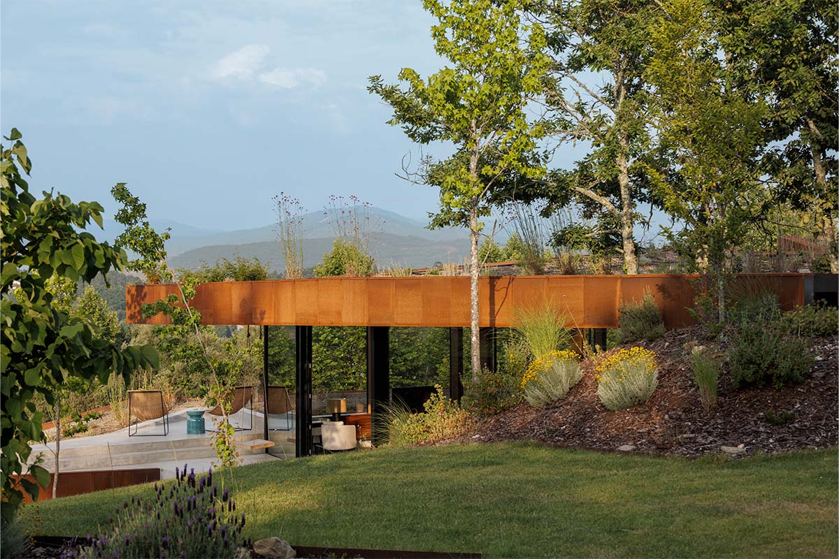 Casa Corten se construye sobre los restos de una antigua fábrica de madera, incorporando acero oxidado como material principal. El proyecto se adapta a un terreno en pendiente mediante volúmenes fragmentados, cubiertas verdes y una organización que prioriza la luz y las vistas.