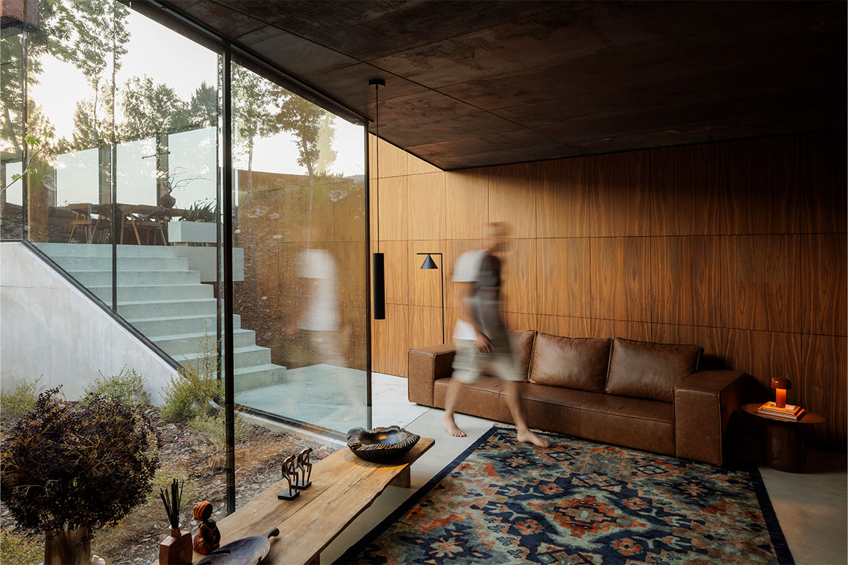El acero corten recubre el exterior, pero también aparece en el interior en puntos específicos, como el acceso y los dormitorios. Ahí se combina con hormigón visto de textura irregular, construyendo una continuidad material que se percibe en todo el proyecto.
