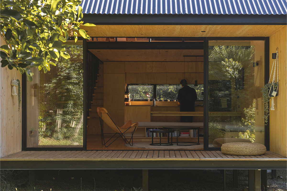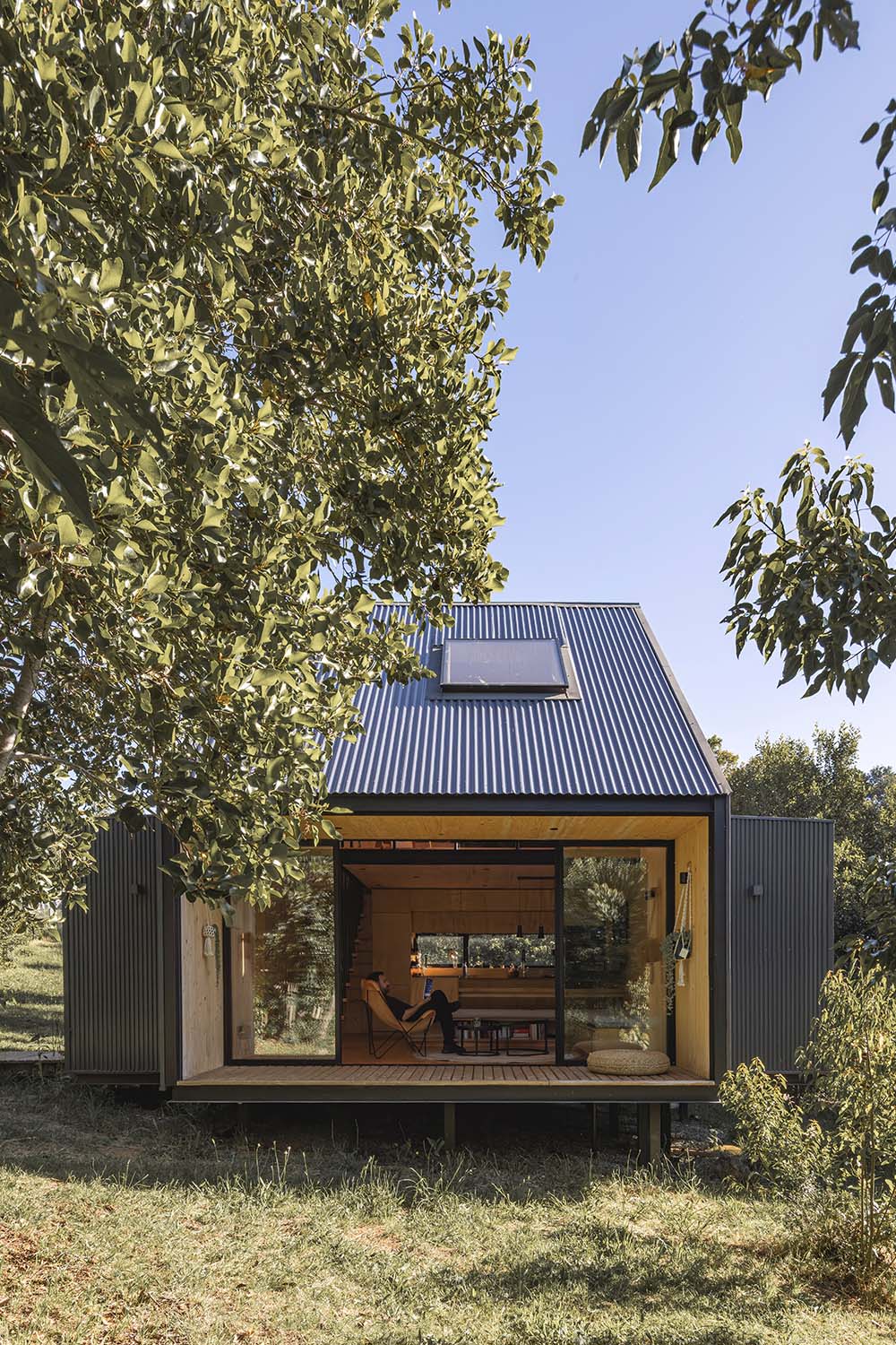 El encargo fue claro: una casa pequeña, flexible, funcional y acogedora, ideal para ser habitada por dos personas, pero también capaz de recibir a más invitados sin perder comodidad. En palabras de Diego Baloian, arquitecto a cargo del proyecto, «la propuesta debía favorecer una espacialidad abierta e integrada, potenciando la sensación de amplitud y fortaleciendo las conexiones visuales entre el interior y el paisaje circundante. La intención era crear un entorno acogedor, propicio para el descanso y la interacción social, asegurando que, pese a tener una superficie acotada, la vivienda siempre se percibiera amplia y confortable.«