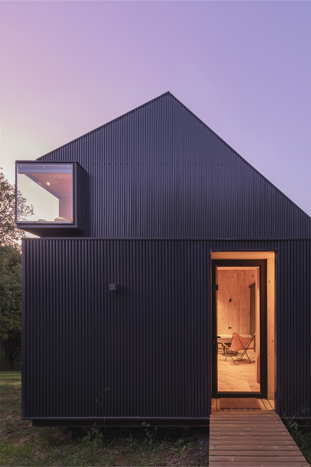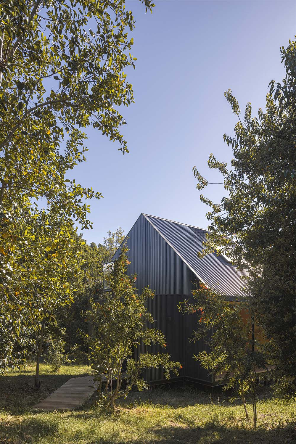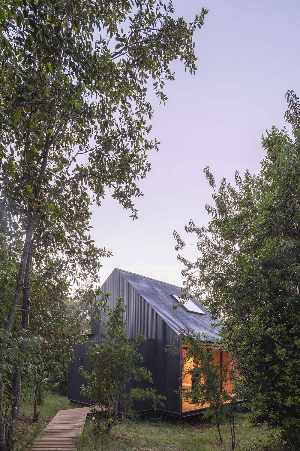 Por fuera, el volumen se cubre con planchas metálicas de alta resistencia, elegidas por su durabilidad y excelente respuesta frente a las lluvias y nevadas de la zona. «Este material asegura impermeabilidad, baja mantención y una durabilidad probada frente a lluvias persistentes y nevadas ocasionales, conformando una piel exterior eficiente y perdurable en el tiempo«, agrega.