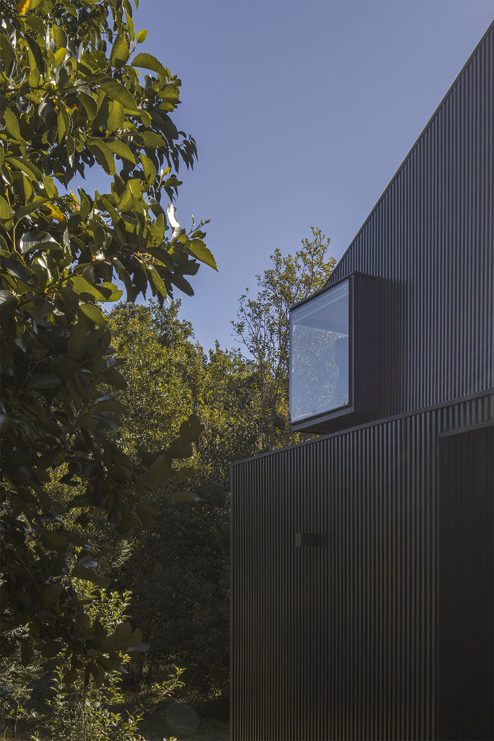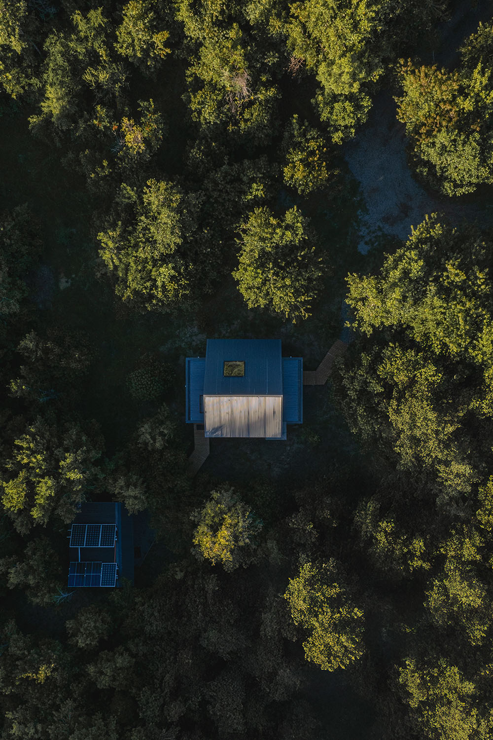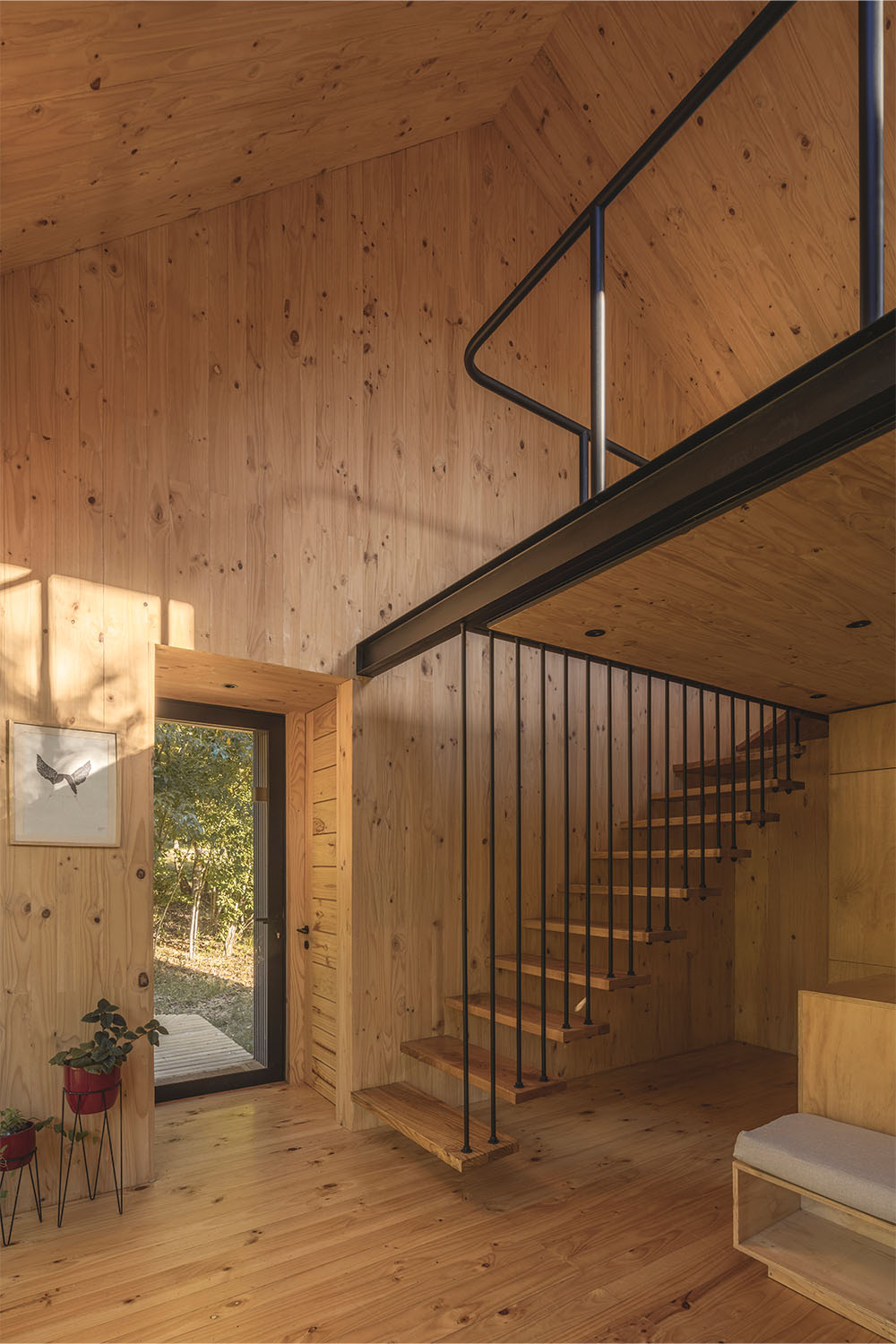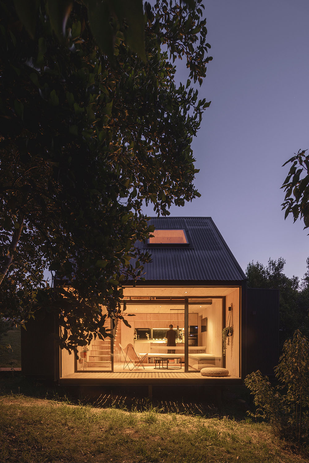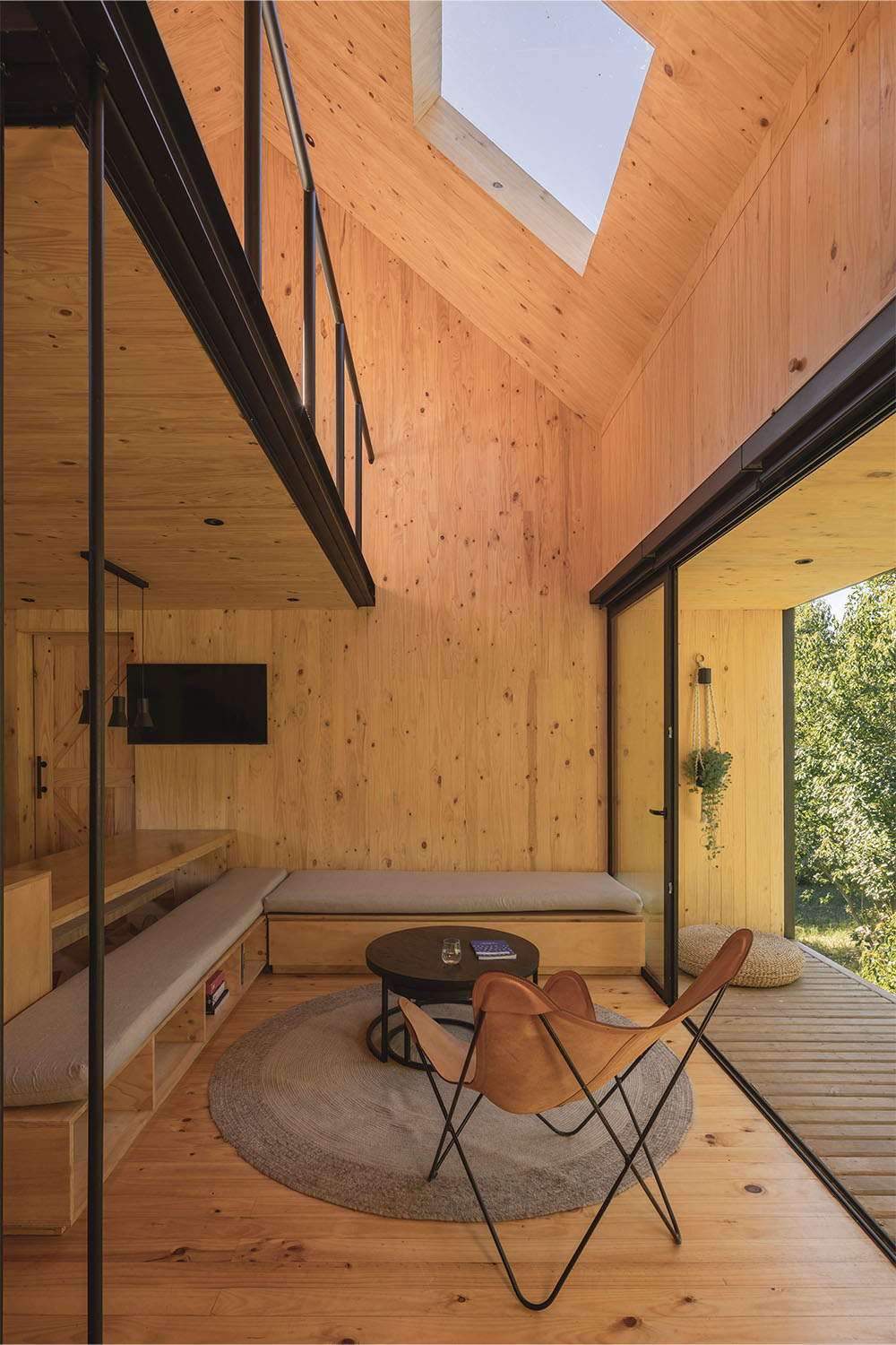 Aunque tiene solo 53 m² interiores y 6 m² de terraza, la casa se siente más amplia. Las dobles alturas, las aperturas bien orientadas y las visuales cuidadas permiten que el bosque se sienta dentro de los espacios. «En el primer nivel, las aperturas de la casa enmarcan cuidadosamente la vista hacia el exterior, estableciendo un diálogo directo entre el interior y el bosque circundante. Una escalera suspendida mediante tensores metálicos resuelve el ascenso con una presencia ligera, y conduce al segundo nivel, donde un volumen en voladizo se proyecta en el remate del recorrido, abriendo una vista frontal hacia el volcán Villarrica», explica Diego.