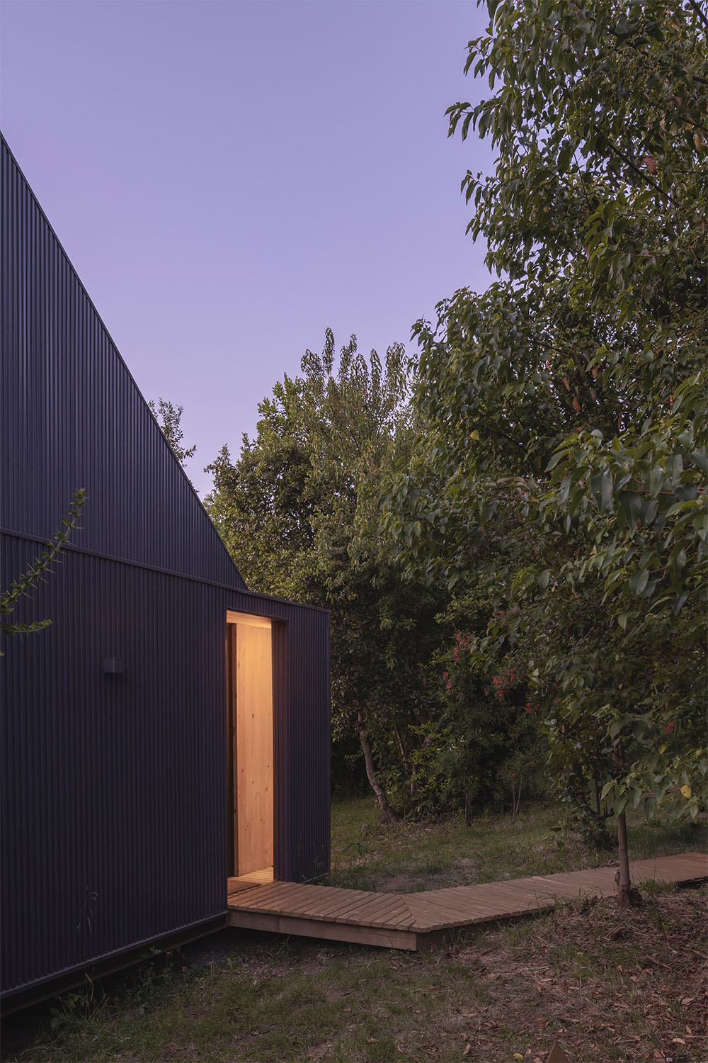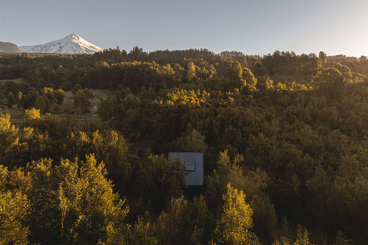 En una zona llamada Zanjón Seco, en una de las laderas del volcán Villarrica, se esconde esta casa diseñada como segunda vivienda dentro de una propiedad familiar. Rodeada por un bosque frondoso, la construcción se emplaza entre árboles nativos y suaves pendientes, en un punto exacto donde se cruzan el ecosistema altoandino y el bosque templado lluvioso. Desde ahí, entre especies como el radal, el maqui, el hualle y el notro – los que forman un manto verde que cambia de tonalidades con las estaciones – la vista hacia el volcán es frontal, abierta e imponente.