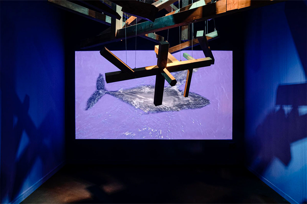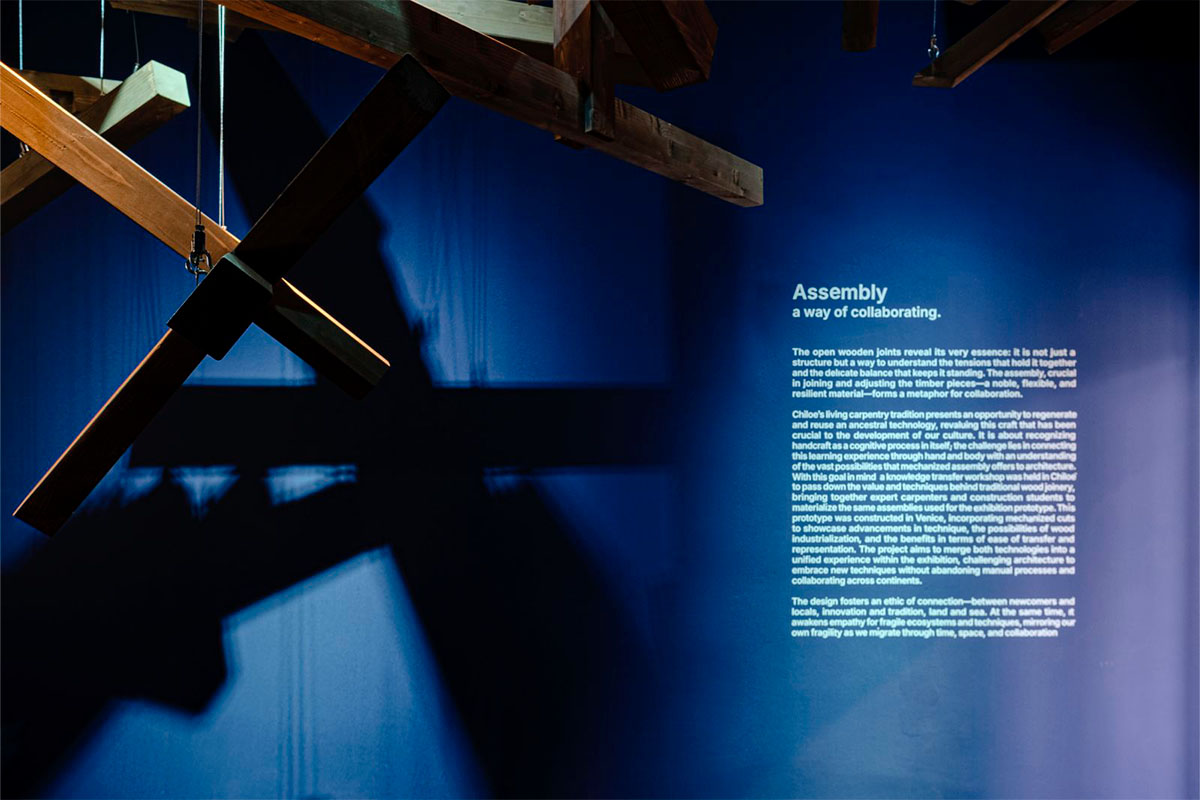 En la sala, una nube suspendida de veinte ensambles chilotes —algunos hechos en Chiloé, otros prototipados con tecnología en Venecia— materializa ese cruce entre tradición y precisión industrial. A esto se suma una película en gran formato que alterna escenas de taller, paisajes marinos y sonidos de ballenas, conectando el oficio carpintero con el territorio que lo vio nacer, dándole contexto a la muestra en el paisaje natural logrando reflexionar y sensibilizar en torno a la fragilidad de nuestro ecosistema.