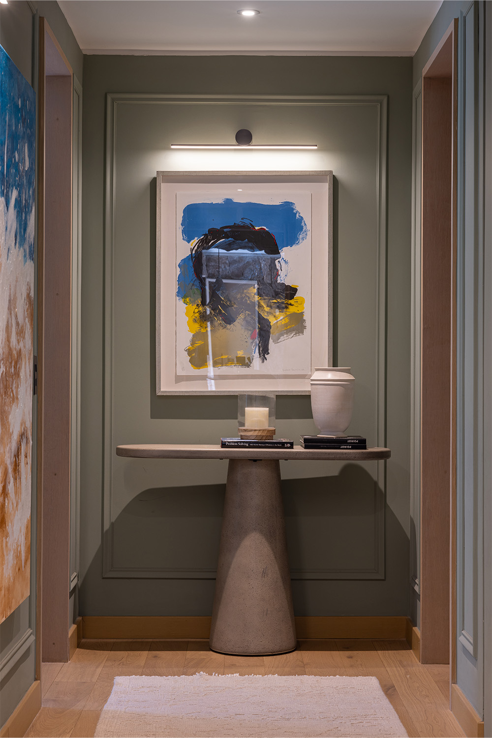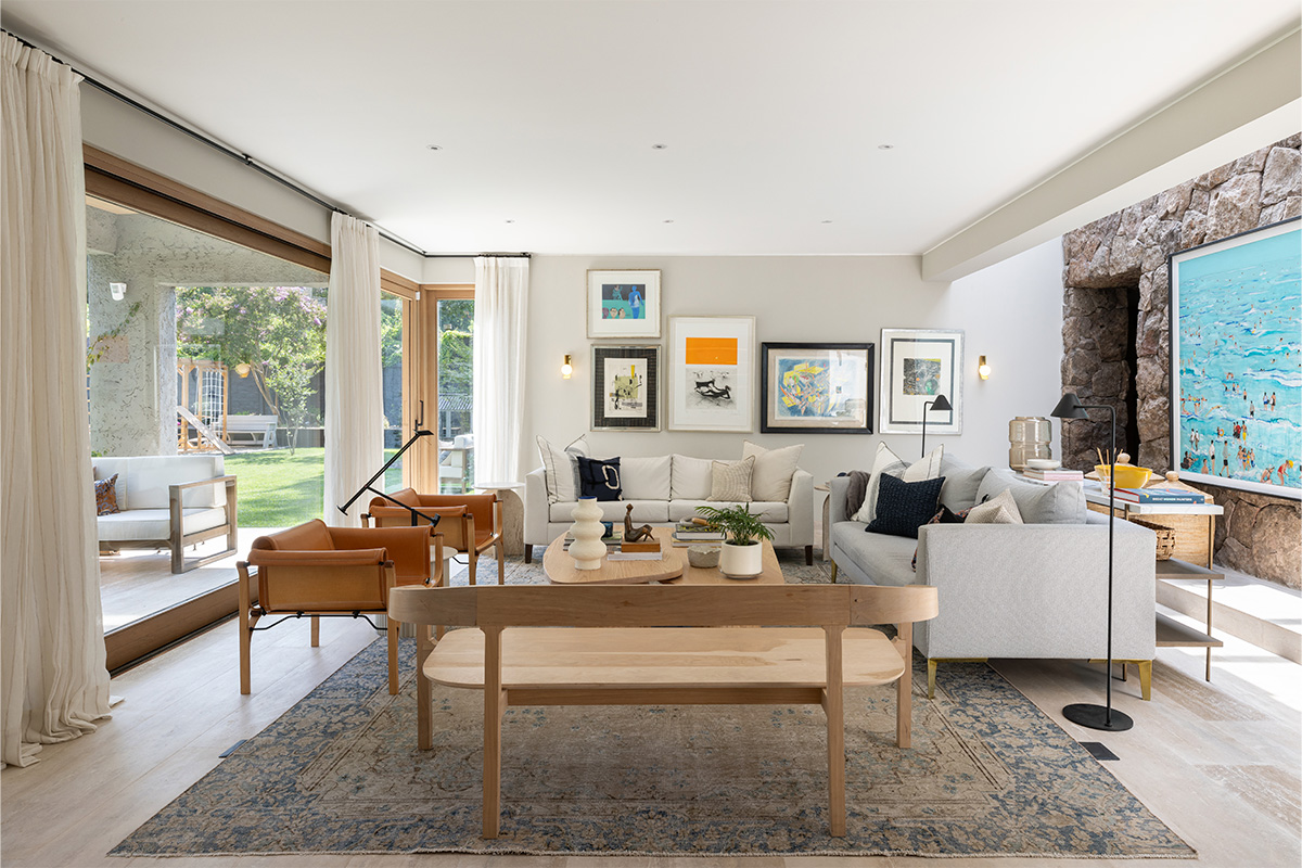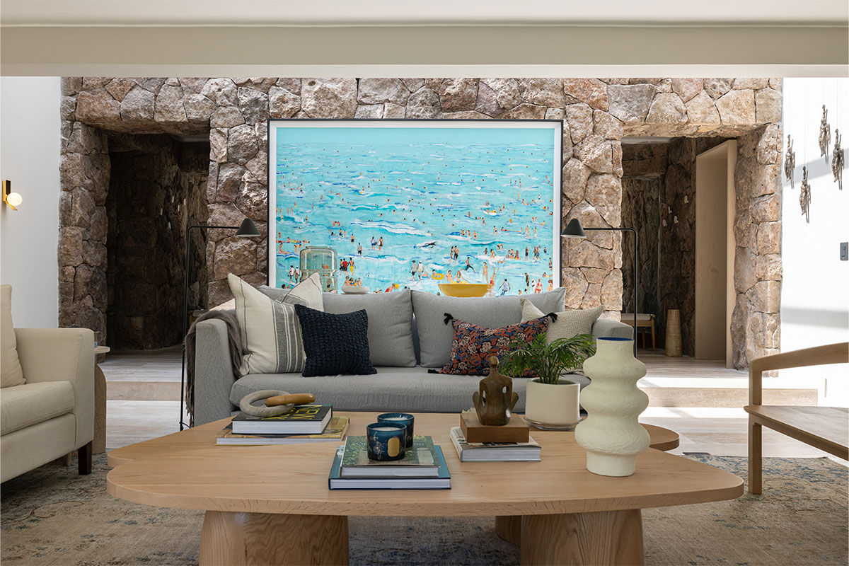 Ese muro se convirtió en el telón de fondo de una gran obra de arte de Fernanda Levin inspirada en el mar. “El living, con esta piedra y la obra que cuelga sobre ella, es el núcleo de la casa. Ahí se concentra todo el carácter y la elegancia que buscábamos, sin dejar de ser un espacio muy acogedor”.