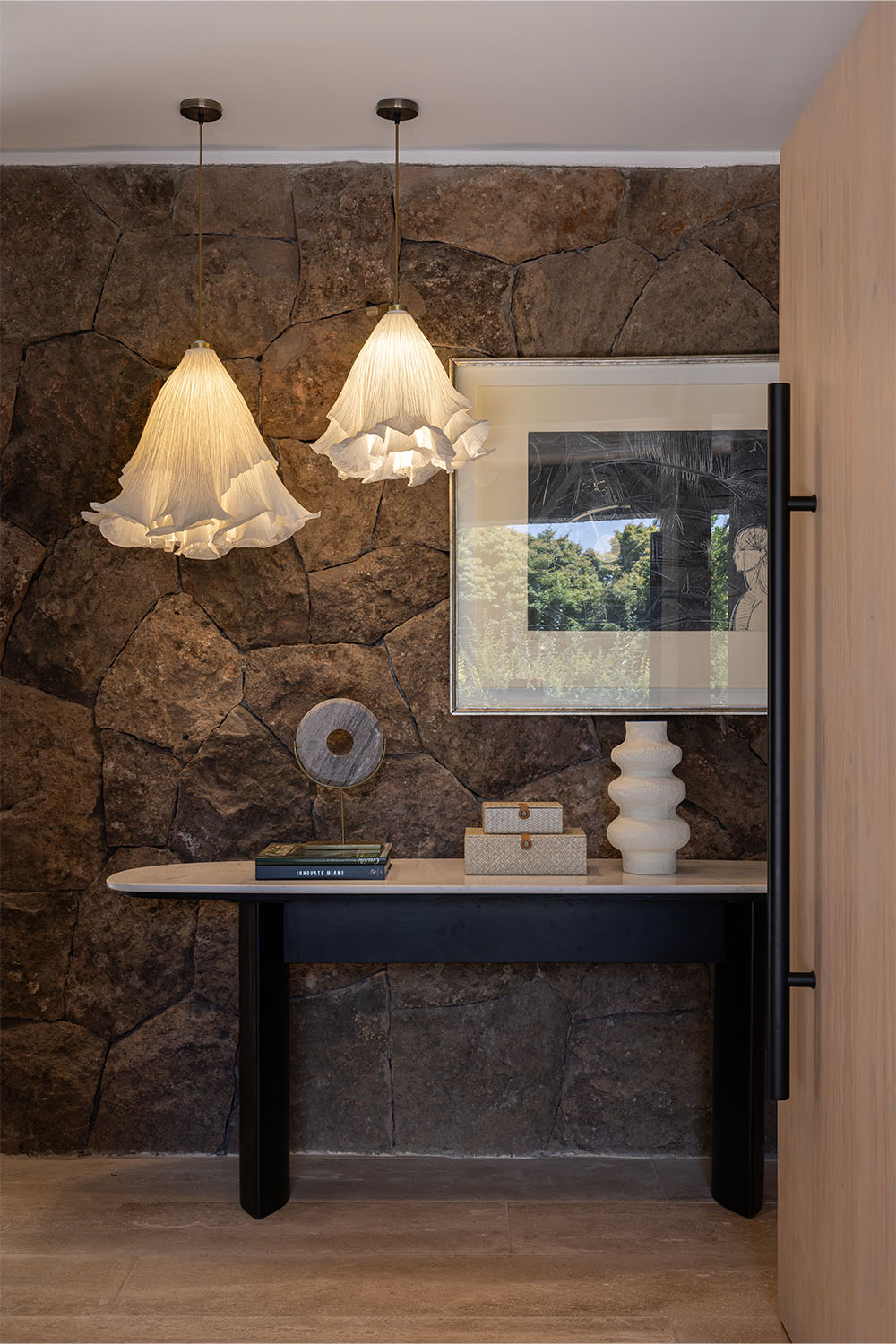 Así comenzó un proceso en el que el interiorismo dialogó desde el inicio con la arquitectura, de la mano del arquitecto Antonio Mundi. El trabajo fue colaborativo desde el primer momento: “Formamos un equipo muy bueno. Hicimos todo en conjunto, desde la selección de materiales y revestimientos hasta la iluminación”, cuenta María José. Y no fue menor: se cambiaron todos los pisos de la casa —incluyendo mármol travertino para las áreas comunes y madera de ingeniería para los dormitorios—, y se mantuvo únicamente un muro de piedra original que delimita el acceso al living. “Era una piedra con mucho carácter, bien viejita. Le hicimos un tratamiento, y aunque a la dueña le producía algo de ruido al principio, sentimos que tenía que quedarse, que era parte del alma de la casa”, dice.