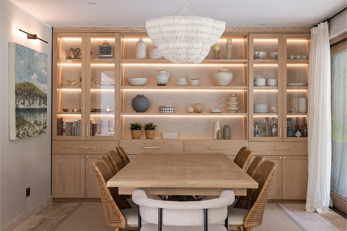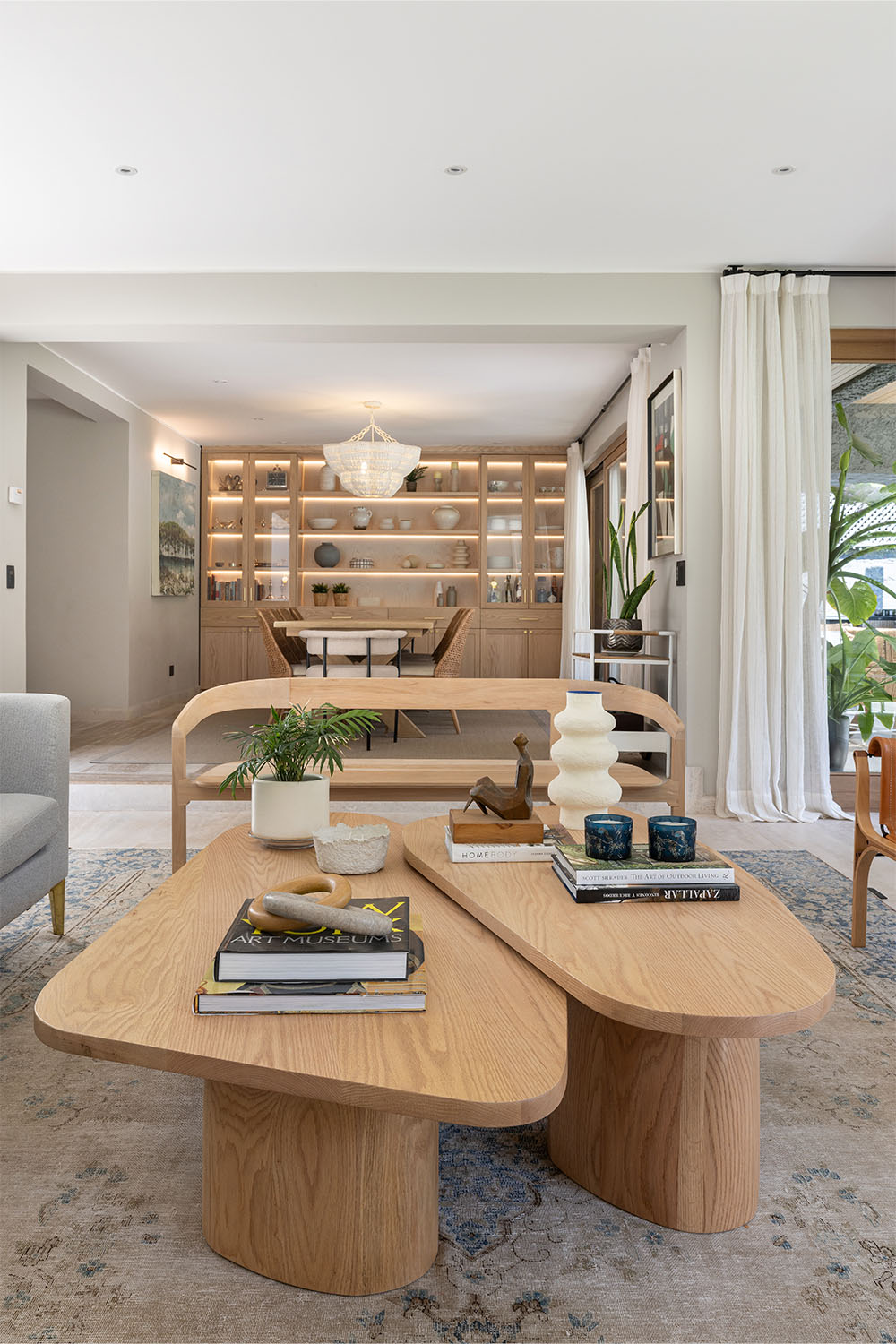 Pero este proyecto no solo se trató de diseño desde cero. Buena parte del desafío fue dar nueva vida a muebles, objetos y obras de arte que los dueños tenían guardados de su etapa en Estados Unidos. “Fuimos a las bodegas con la dueña de casa. Fue como una búsqueda del tesoro. Había cosas que ni siquiera se acordaba que tenía”, recuerda la interiorista. El proceso incluyó levantar medidas, hacer fotomontajes y pensar en la mejor ubicación para cada pieza: “Hubo muchos muebles que tuvimos que adaptar, tapizar o ajustar en proporciones. También diseñamos nuevos, como las mesas de centro del living, que se entrelazan como dos esculturas orgánicas”.