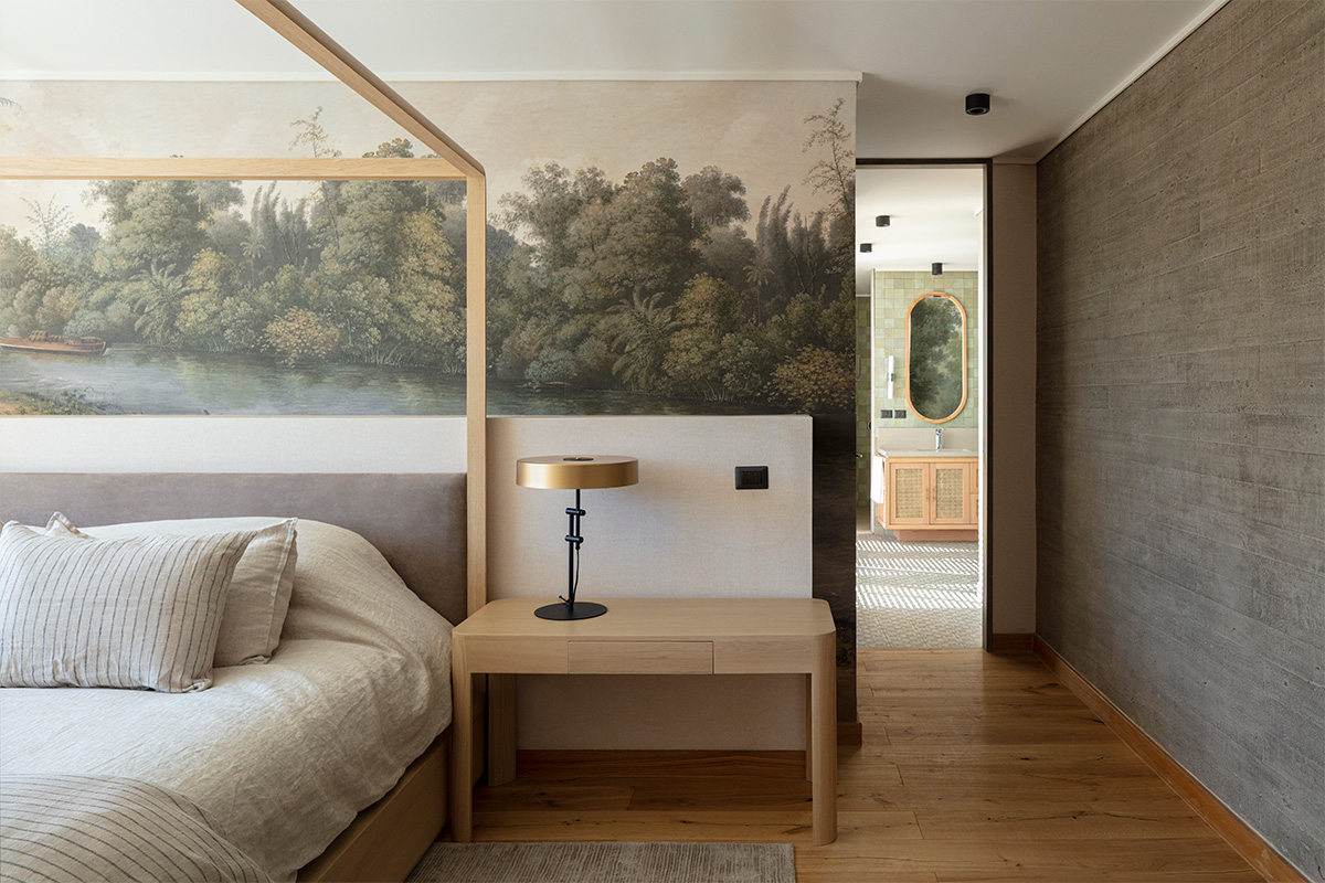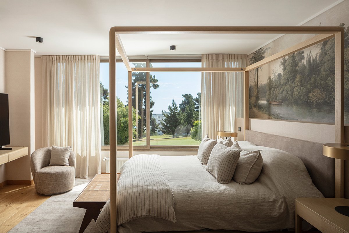 La visión de sus dueños era habitar una casa en la playa que no pareciera de playa. Y. partir de ahí, el proyecto, desarrollado por el estudio de diseño interior Renovare, a cargo de la arquitecta Ignacia Salas, tomó un rumbo claro. La vegetación del entorno —más cercana a un parque que a la arena— marcó la pauta. La propuesta fue incorporar ese paisaje como parte activa de la experiencia interior, especialmente en espacios íntimos como el dormitorio y el baño principal. Papeles murales con horizontes infinitos, referencias a bosques y paisajes casi oníricos, transforman algunos de los espacios en escenarios que evocan un edén personal, más introspectivo que costero.