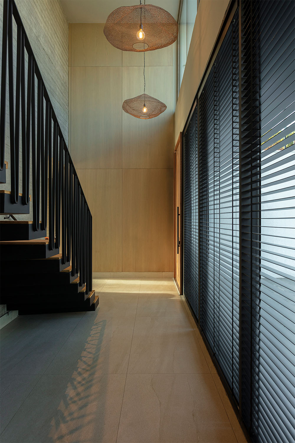 Materialmente, los muros de hormigón —que fueron unos de los requerimientos del mandante— se combinan con grandes paños de madera fabricada especialmente para esta casa, aportando profundidad y textura. Los pavimentos, todos en porcelanato por su practicidad, varían según uso: uno pétreo en áreas comunes, otro para dormitorios secundarios. Para la suite principal, el mismo cliente eligió un piso de ingeniería en madera, cálido y envolvente.