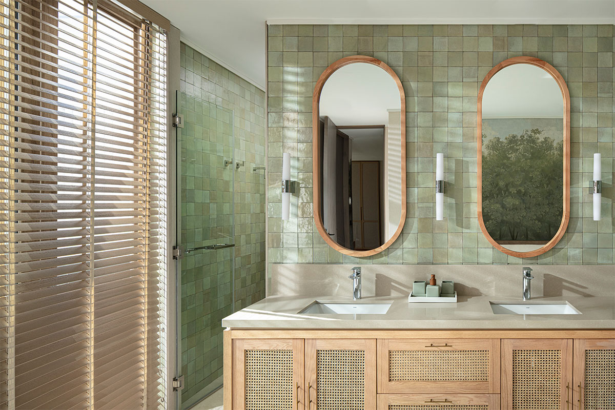 Uno de los puntos más trabajados fue el baño principal. Con experiencia en diseño hotelero, el equipo buscó optimizar su funcionalidad: cabinas independientes, tina como punto focal y revestimientos en grandes formatos. La generosa altura de los techos permitió reforzar esa sensación de estándar elevado, casi de spa privado.