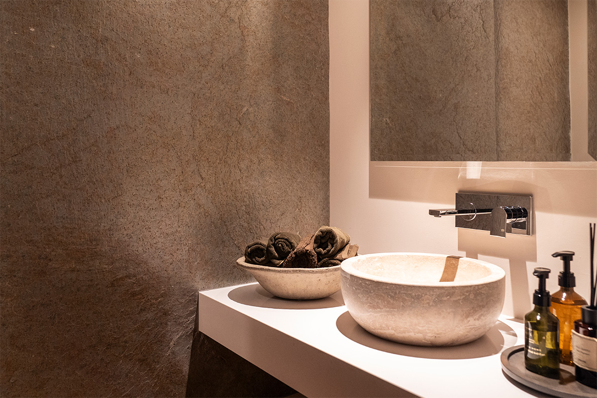 En la decoración – y buscando una identidad serena y sensorial – se privilegiaron materiales táctiles y cálidos: madera natural, piedra sintetizada, granos en revestimientos, estuco para muros continuos y una selección de textiles que aportan suavidad sin estridencias.