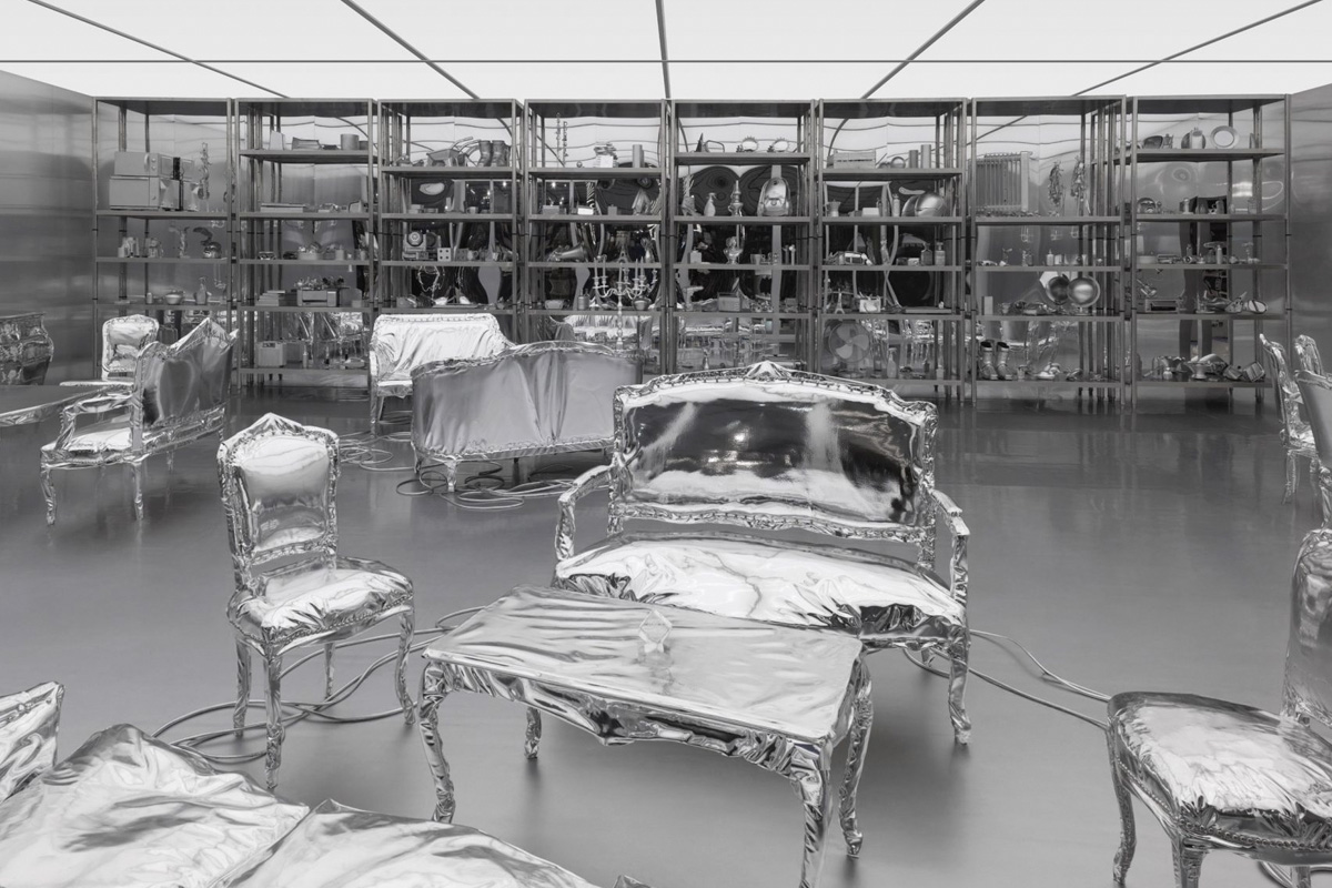 Lo que a primera vista parece un salón convencional está atravesado por una intervención radical. No hay productos destacados ni pedestales individuales como en un stand tradicional; todo se presenta como una escena única y continua. Pero lo decisivo es que cada elemento está cubierto por una capa plateada uniforme que borra color, textura y época. El suelo reflectante y la iluminación cenital acentúan la sensación de un entorno controlado, casi clínico. Al tratar por igual una escultura clásica y una botella anónima, la instalación elimina jerarquías y desplaza la atención hacia la forma y el volumen.