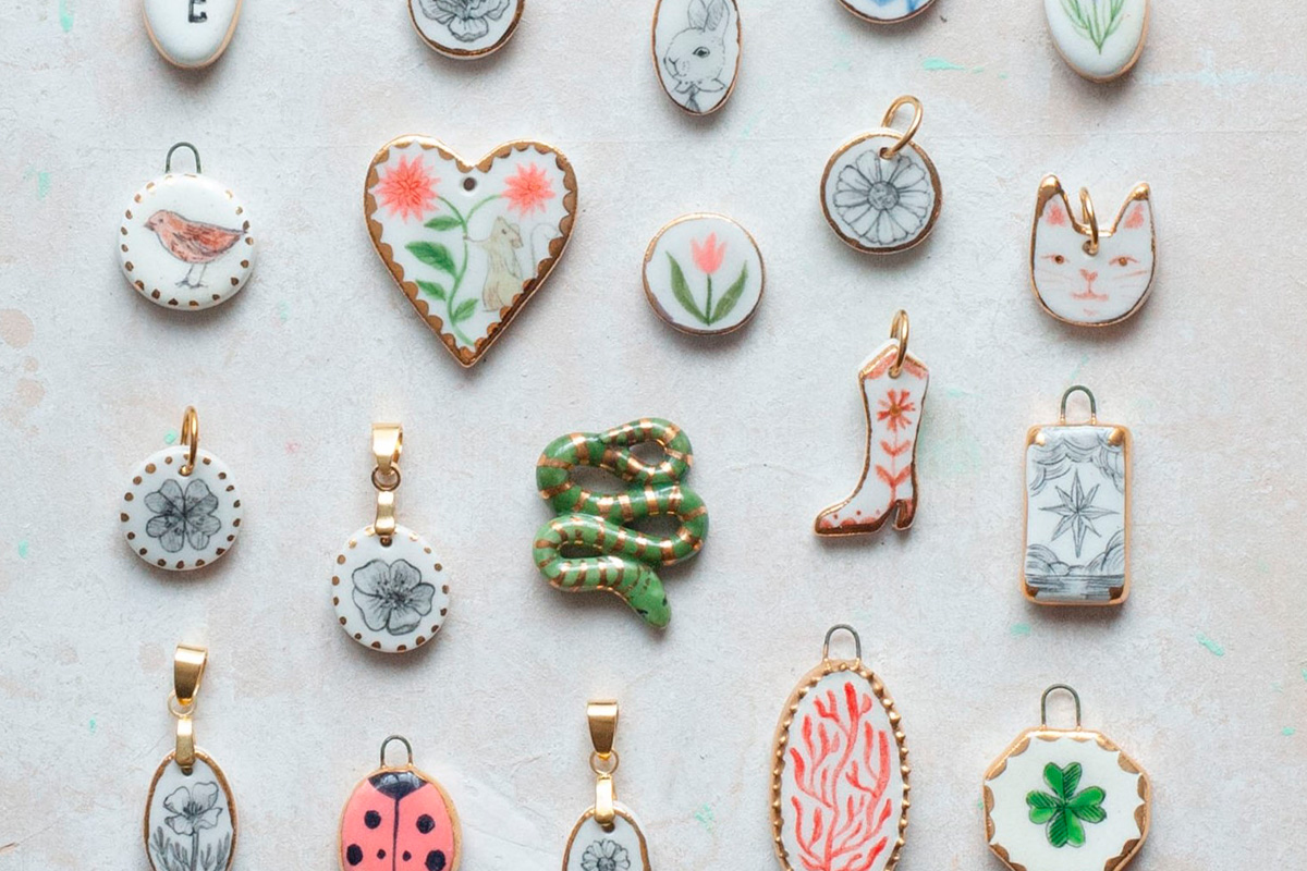 Hay piezas que obligan a acercarse. No por grandilocuentes, sino por delicadas. Los colgantes de Camila Álamos, creadora de Minerva Oficios, funcionan así: pequeños mundos de cerámica ilustrada donde conviven ratoncitos, gatos, flores y caracoles que aparecen solo cuando uno se detiene a mirar bien.