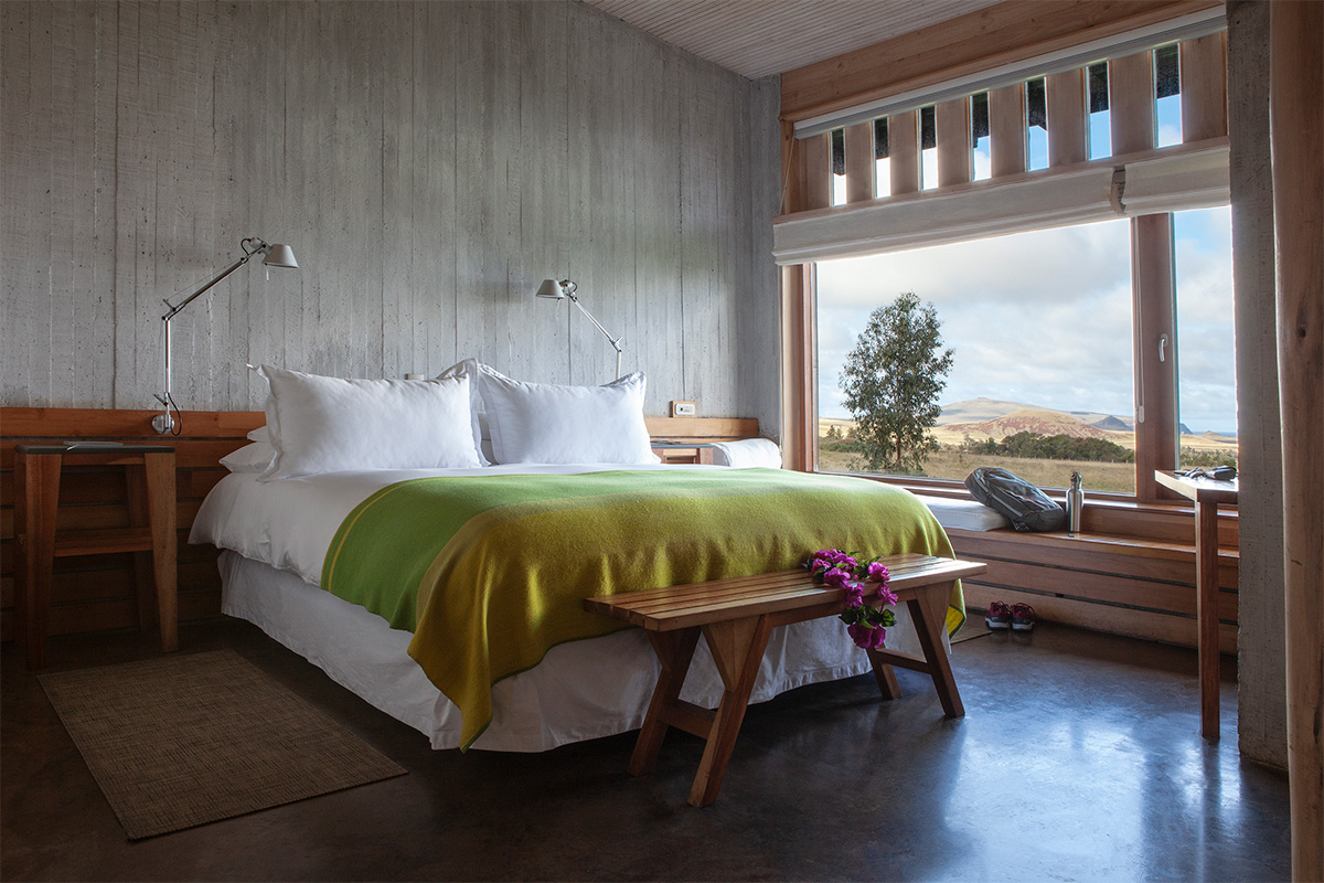 Las 75 habitaciones fueron concebidas por la diseñadora chilena Paula Gutiérrez y construidas con troncos de ciprés, arcilla y piedra volcánica. Todas cuentan con terrazas privadas y bañeras con vistas hacia la vegetación o el océano, reforzando la relación entre interior y paisaje.