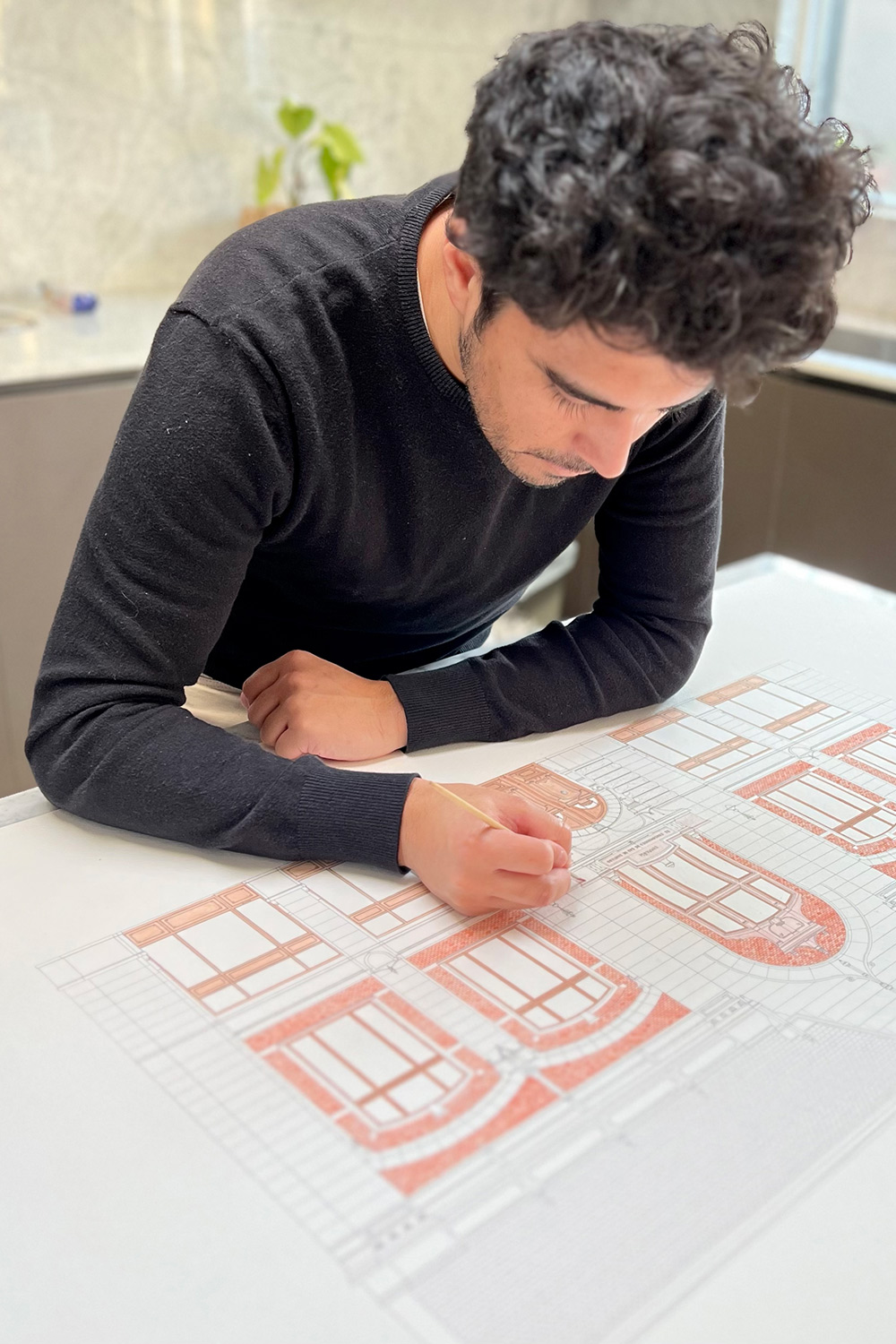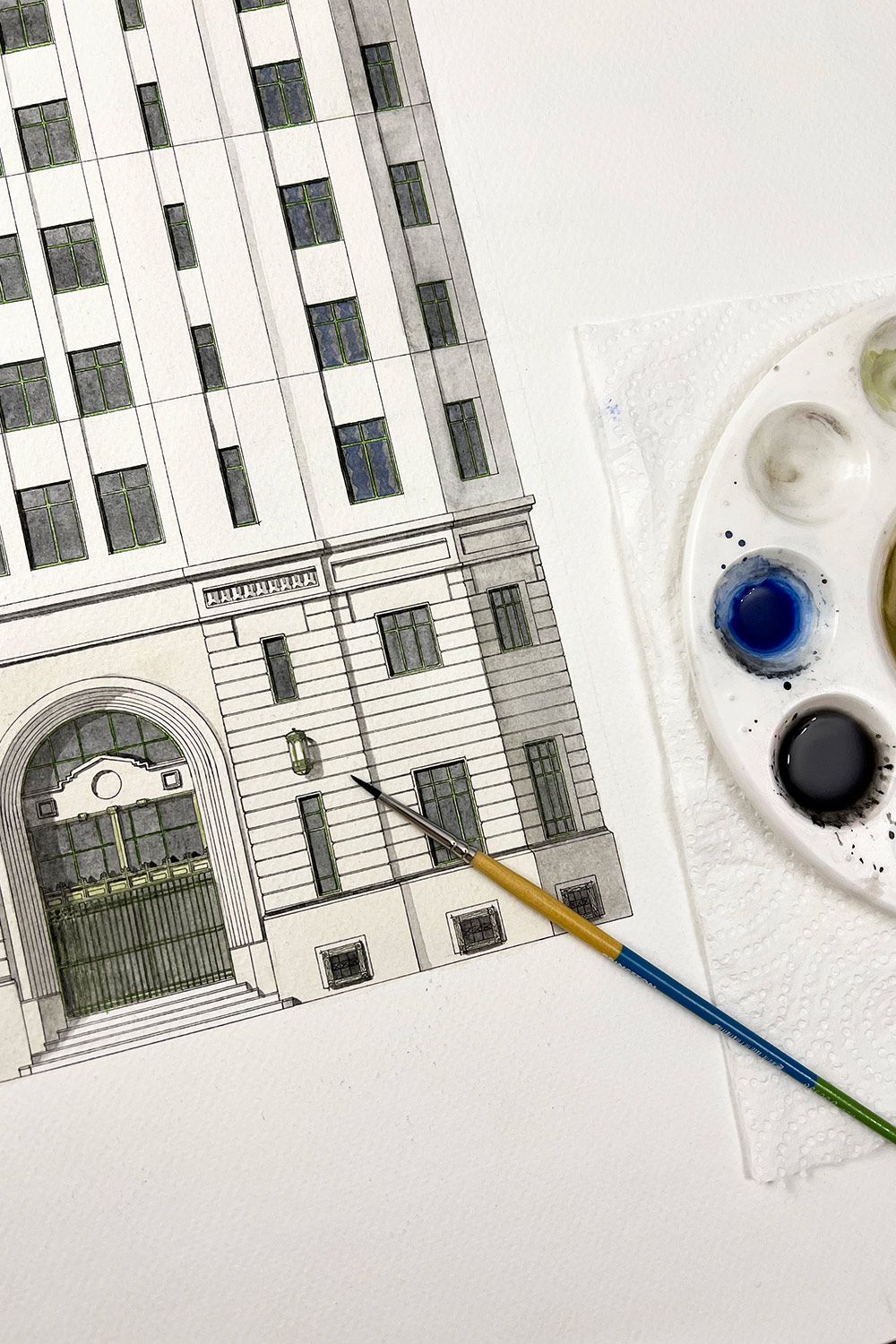 El artista utiliza el dibujo como una herramienta de registro e investigación de numerosas edificaciones históricas, con el objetivo de conservar el patrimonio cultural y arquitectónico de estas. Este trabajo se complementa con su técnica artística a través de la utilización de reglas, papel, grafito, compases, tinta y acuarela, rescatando el antiguo arte del dibujo manual.